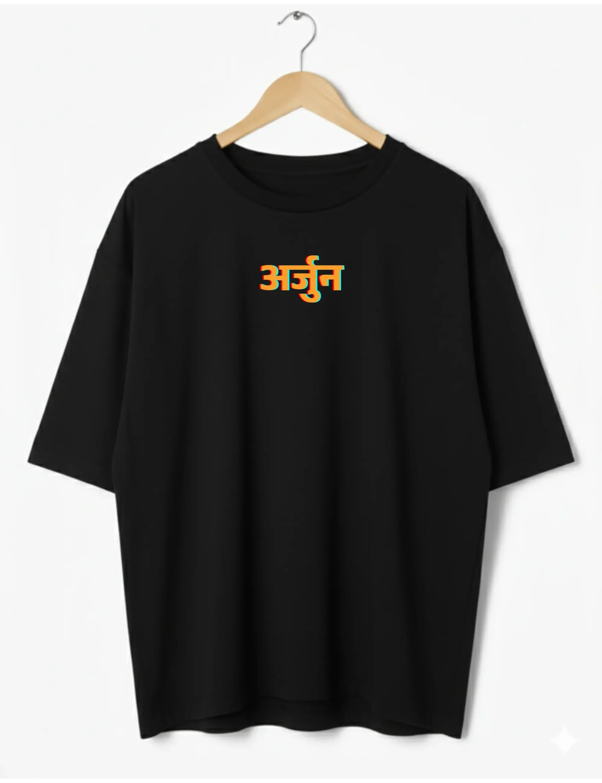 This unisex oversized t-shirt features a bold graphic of Arjun, the legendary warrior. Made from 240 GSM 100% cotton, it is soft, comfortable, and long-lasting. The fabric is super combed, pre-shrunk, and bio-washed for a smooth feel. The Lycra ribbed neck adds strength and helps the t-shirt keep its shape, making it great for everyday wear.
