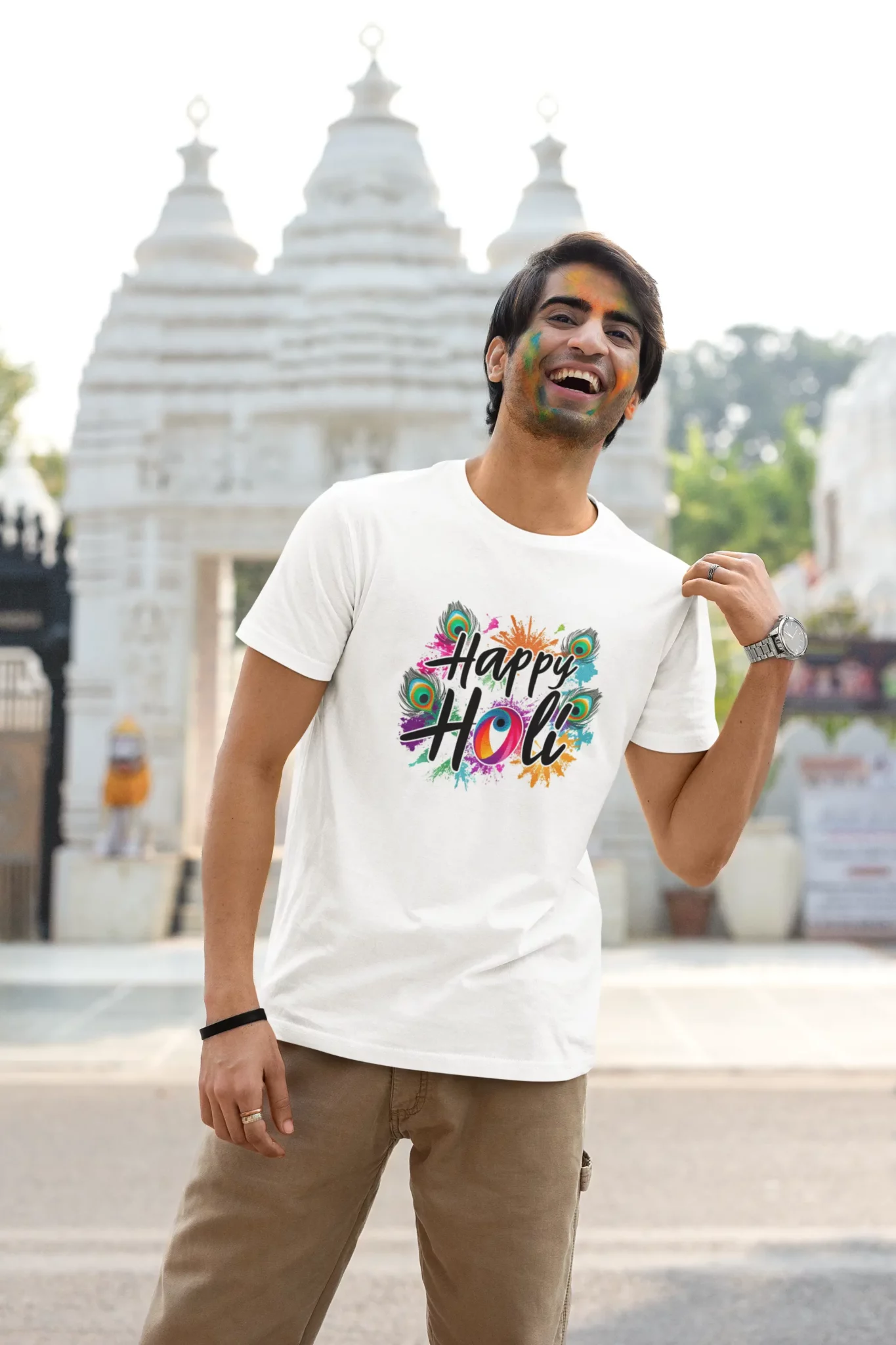 This white T-shirt, emblazoned with “Happy Holi” amidst a vibrant explosion of colors, is your ideal companion for the festival of colors. The peacock feather elements add a traditional twist to the modern design, making it a unique piece for the occasion. Soft and comfortable for all-day wear, this tee is a fantastic choice for those who want to spread happiness and soak in the spirit of Holi.