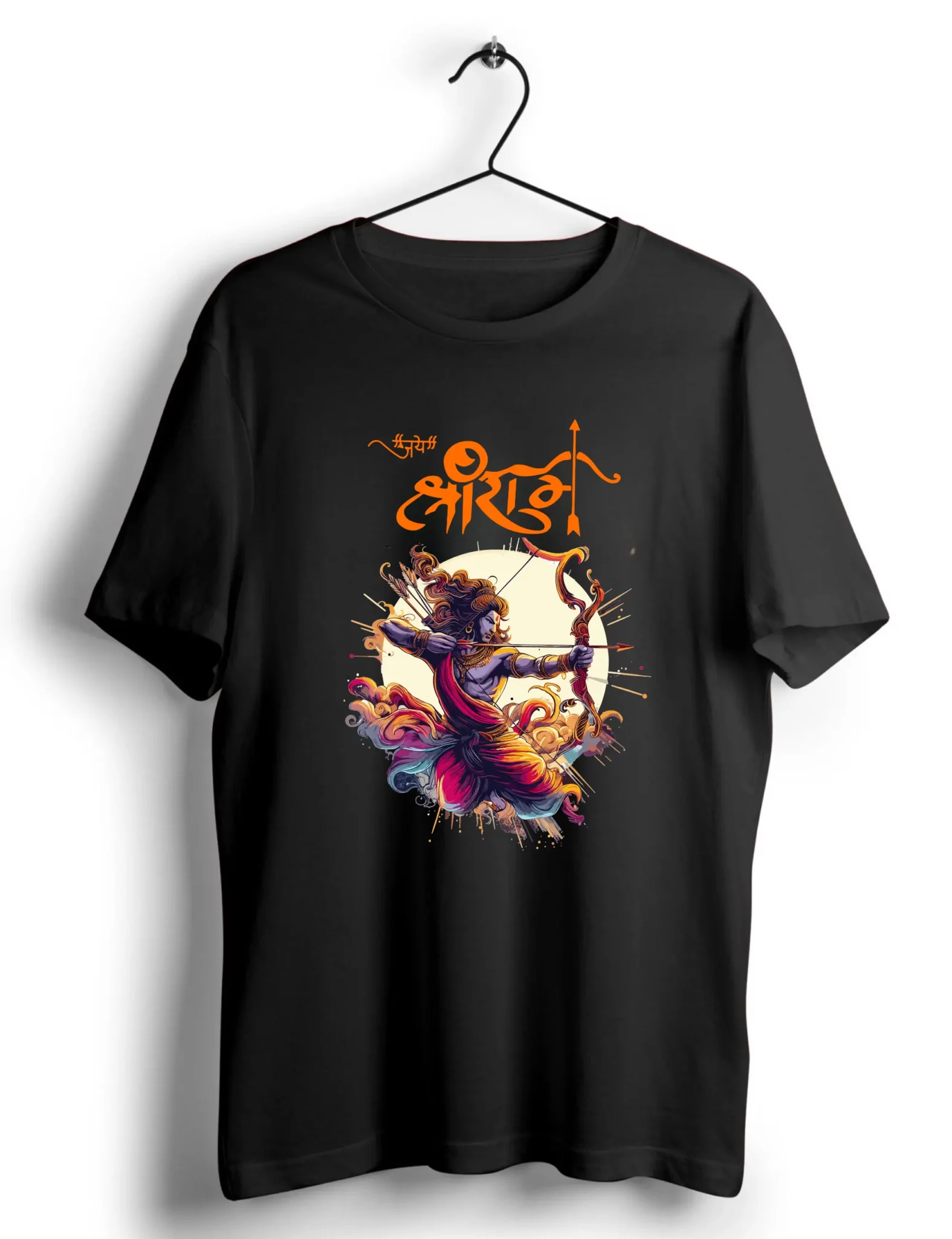 The t-shirt features an artistic depiction of Lord Ram in a dynamic warrior pose, surrounded by an explosion of colorful, stylized design elements, with the phrase “Jai Shree Ram” printed above in a stylized script.