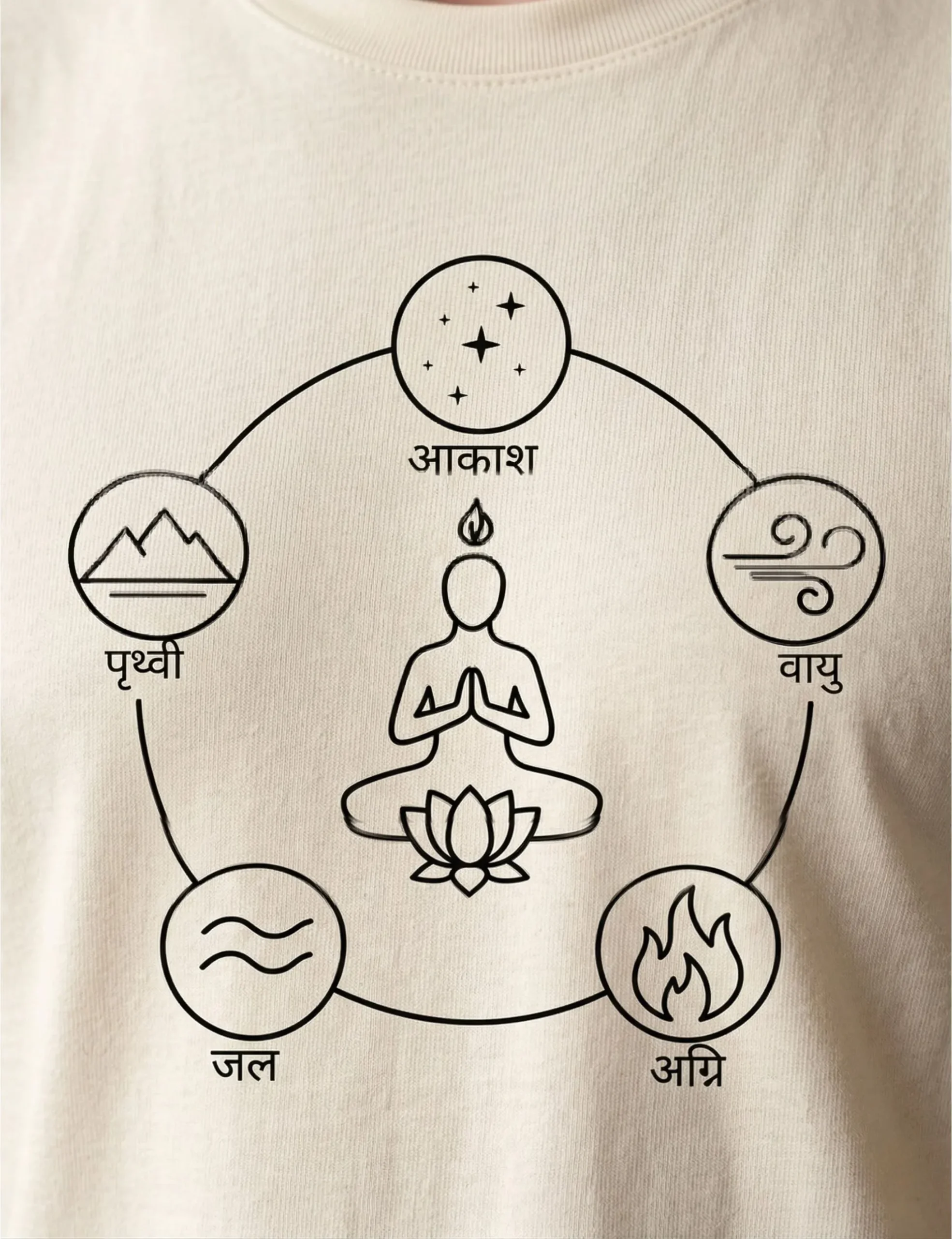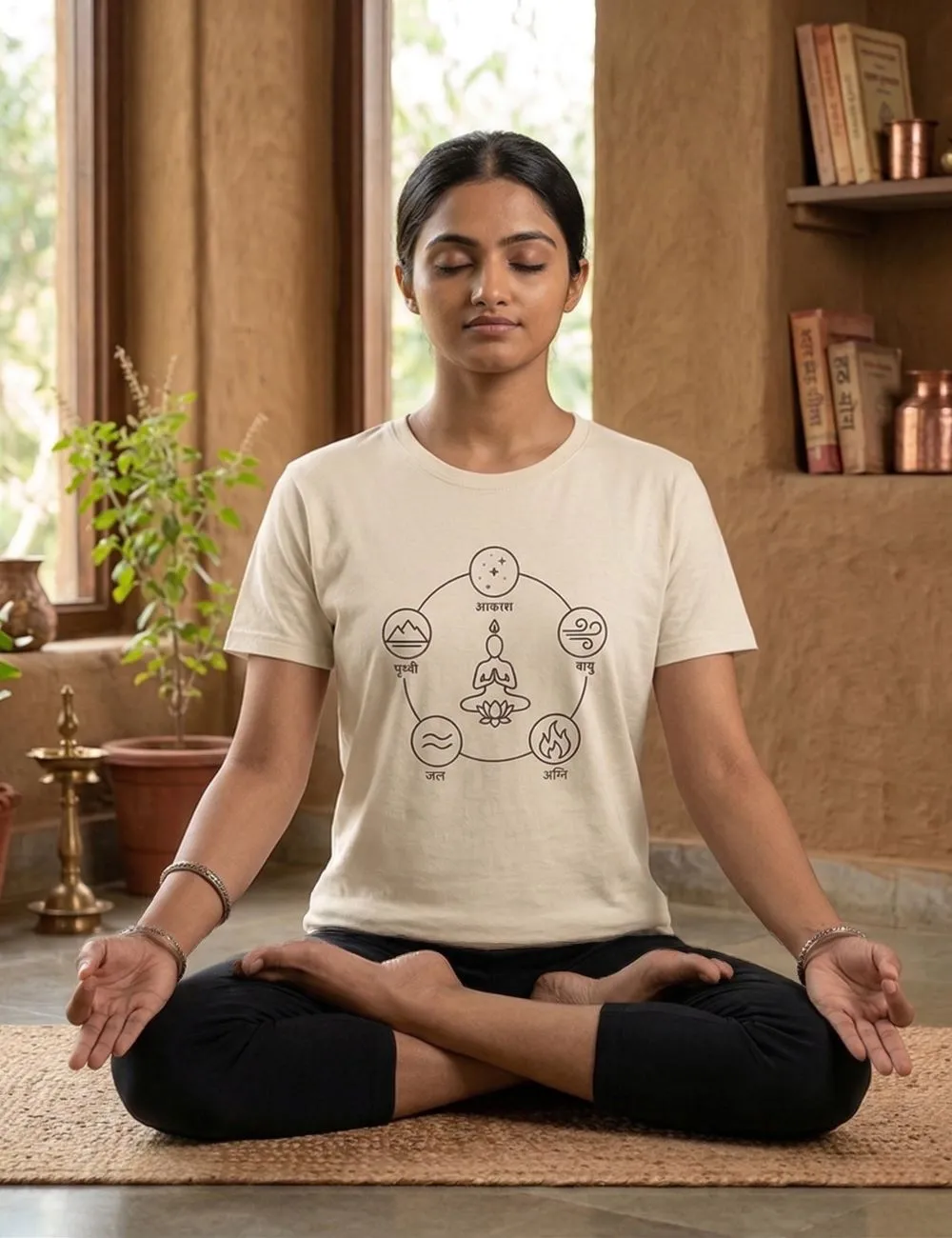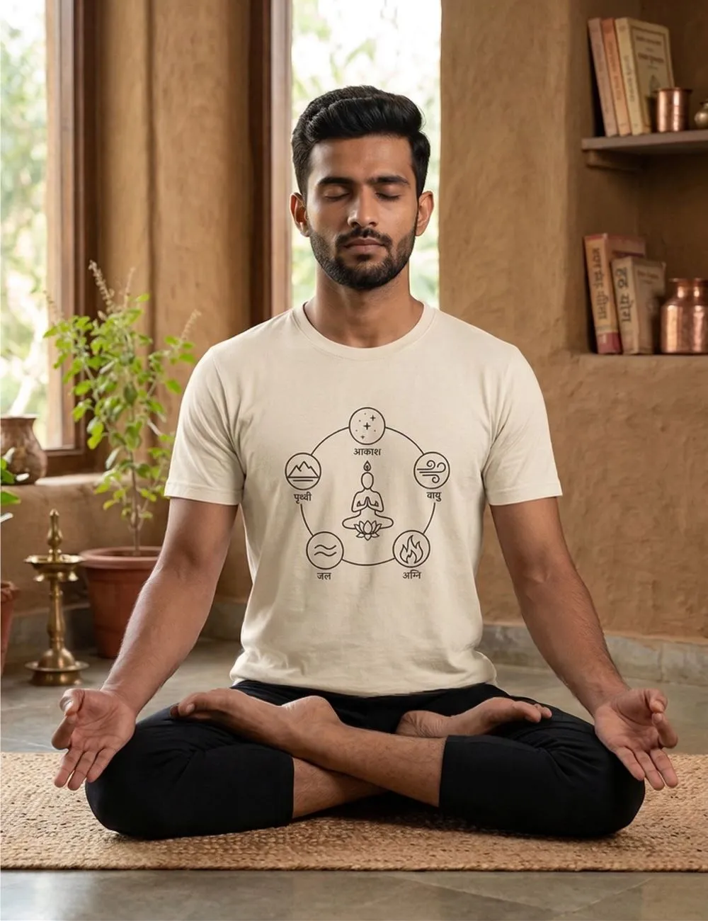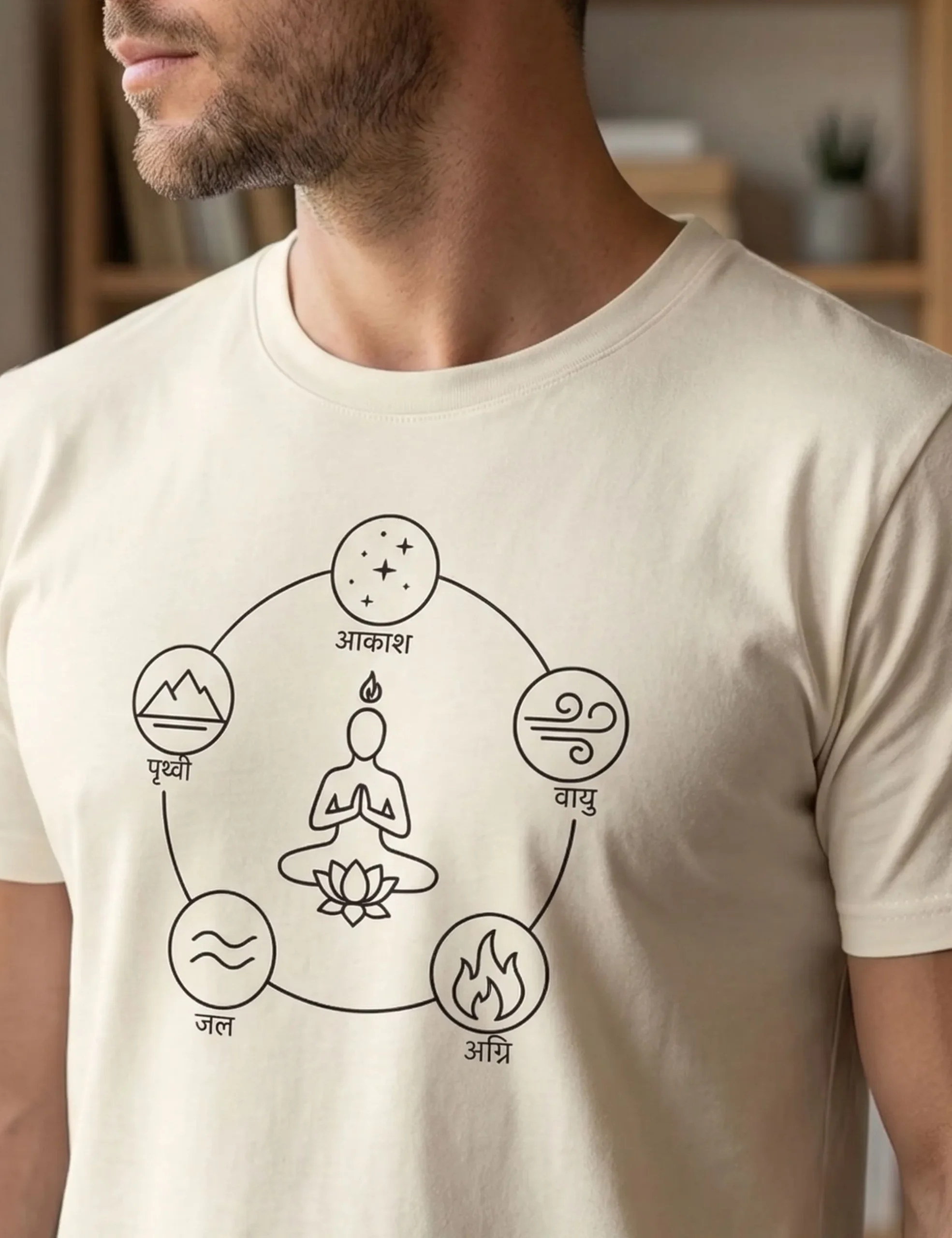This T-shirt shows a peaceful meditation pose at the center. Around it, the five elements are drawn in a simple circle. You can see sky, air, fire, water, and earth, each with small symbols and Hindi names. The design feels calm and balanced.