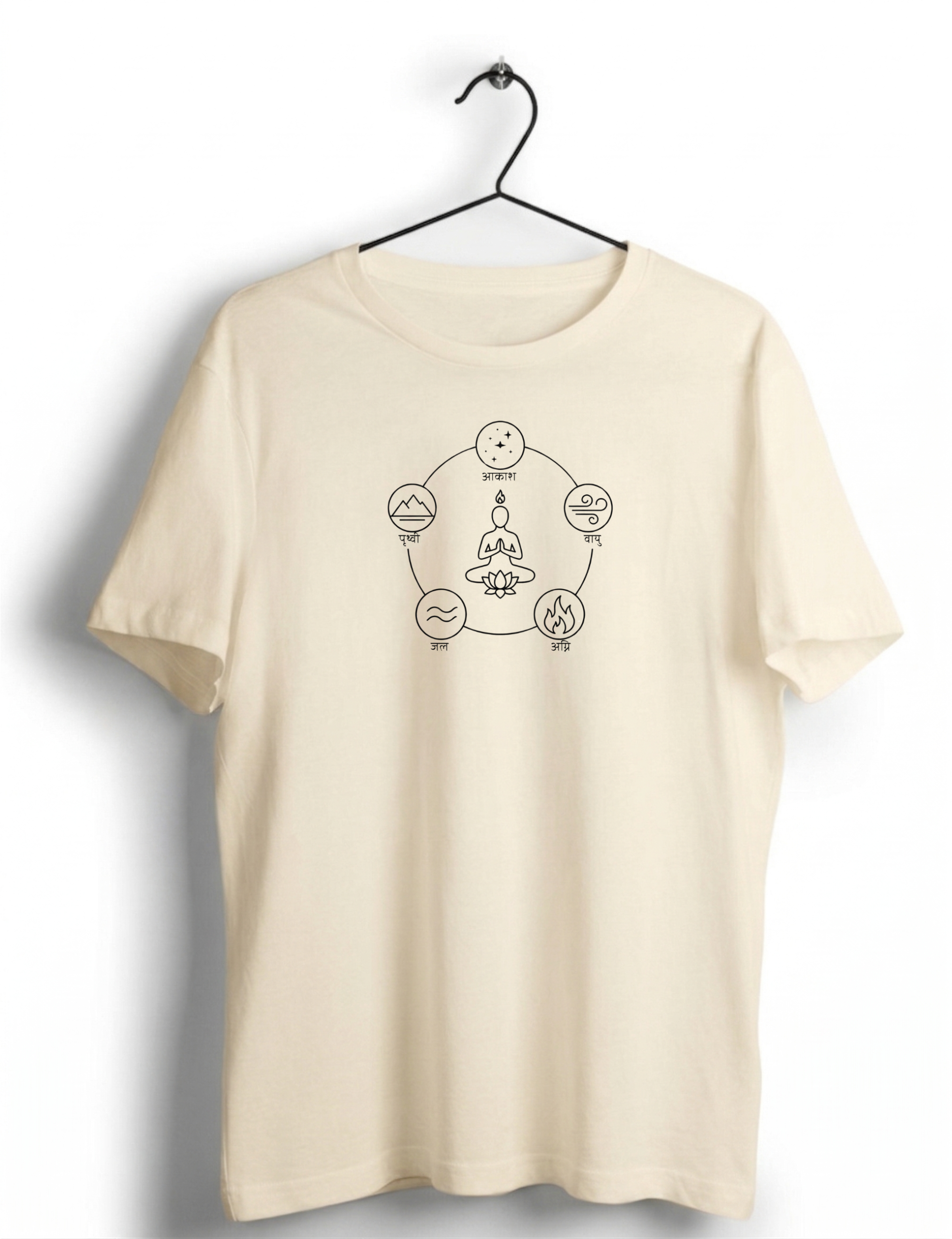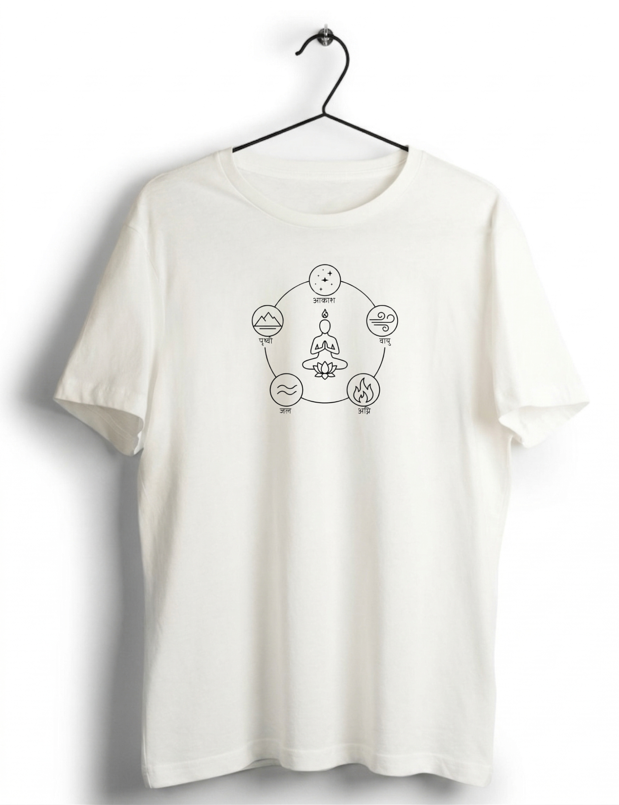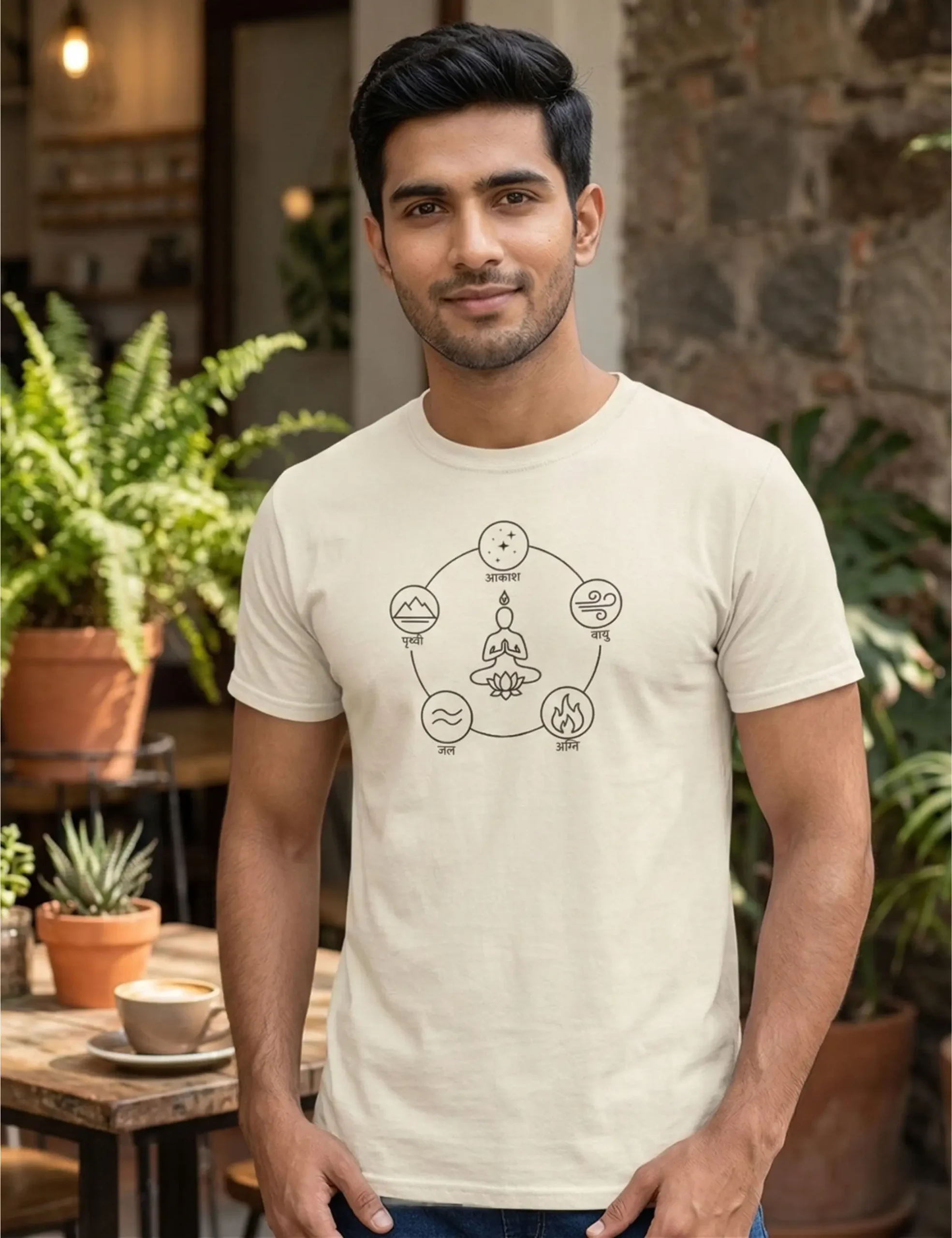 This T-shirt shows a peaceful meditation pose at the center. Around it, the five elements are drawn in a simple circle. You can see sky, air, fire, water, and earth, each with small symbols and Hindi names. The design feels calm and balanced.