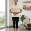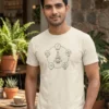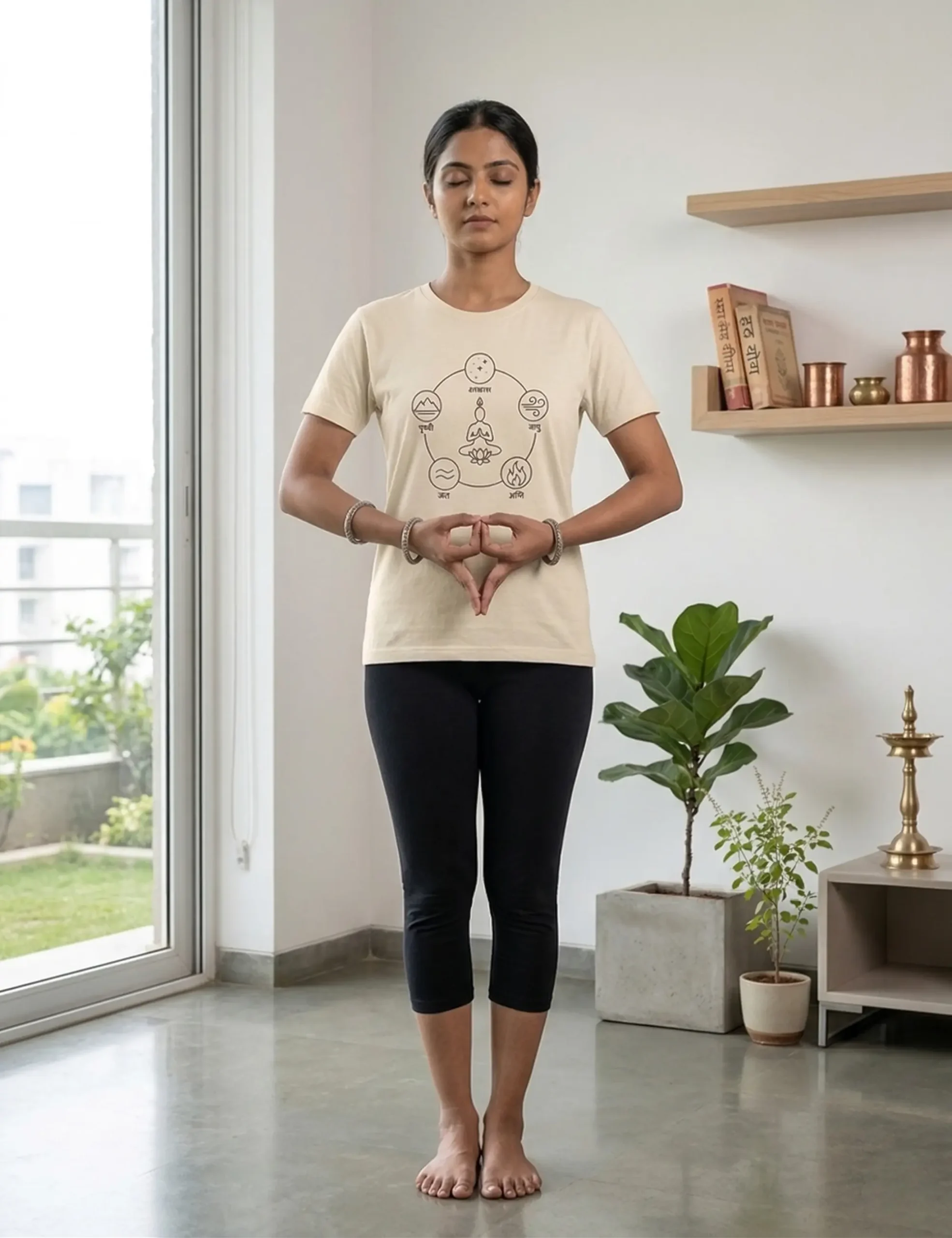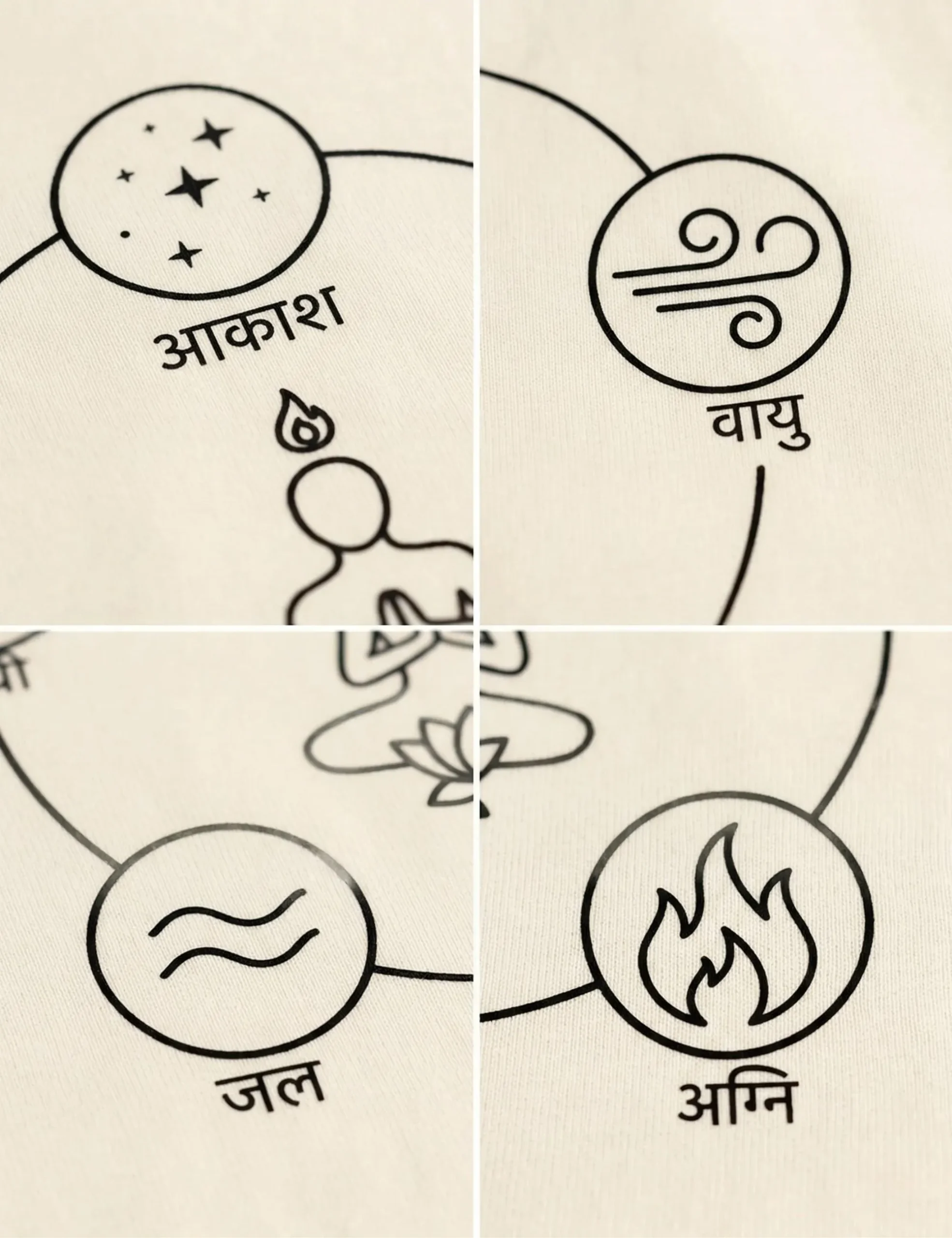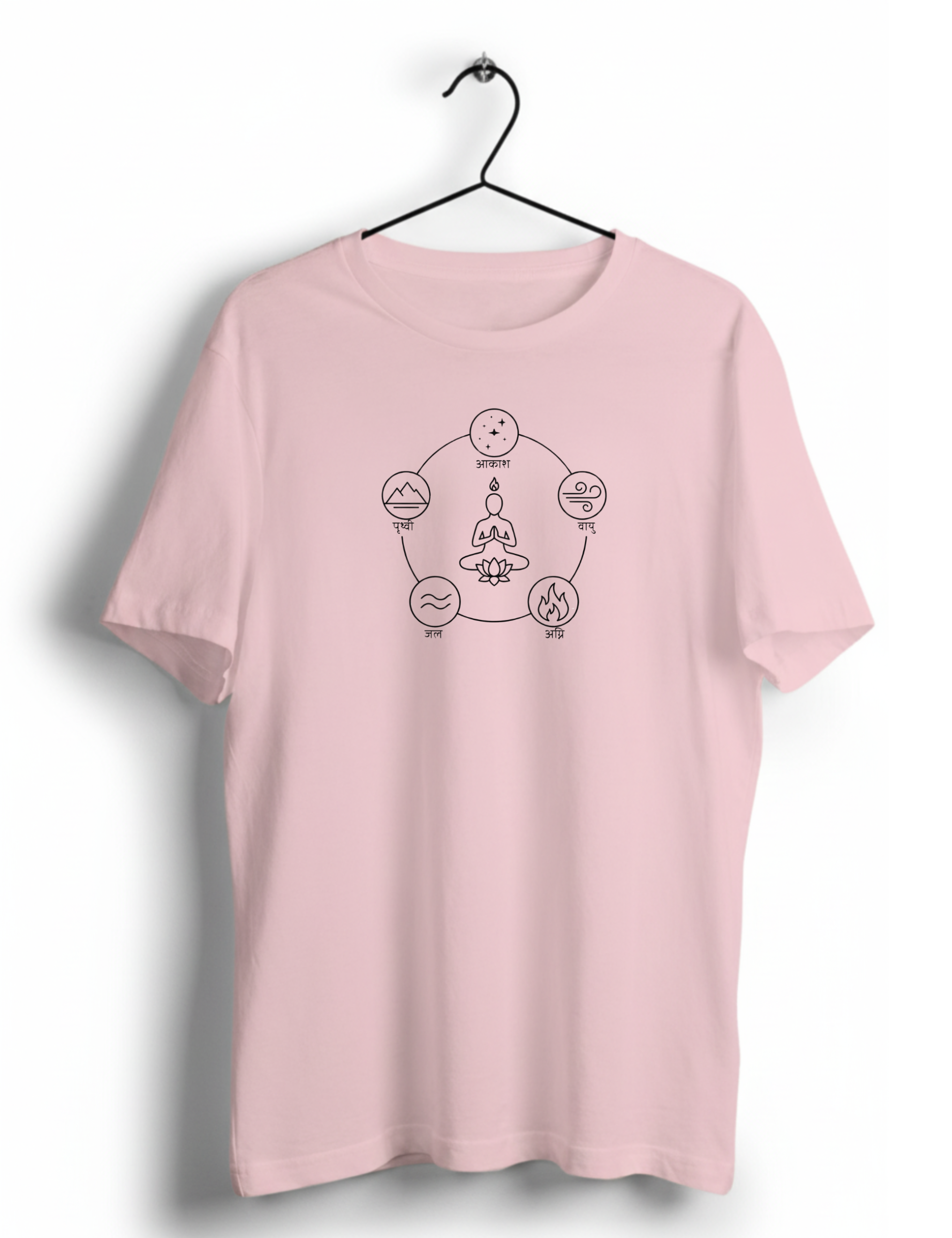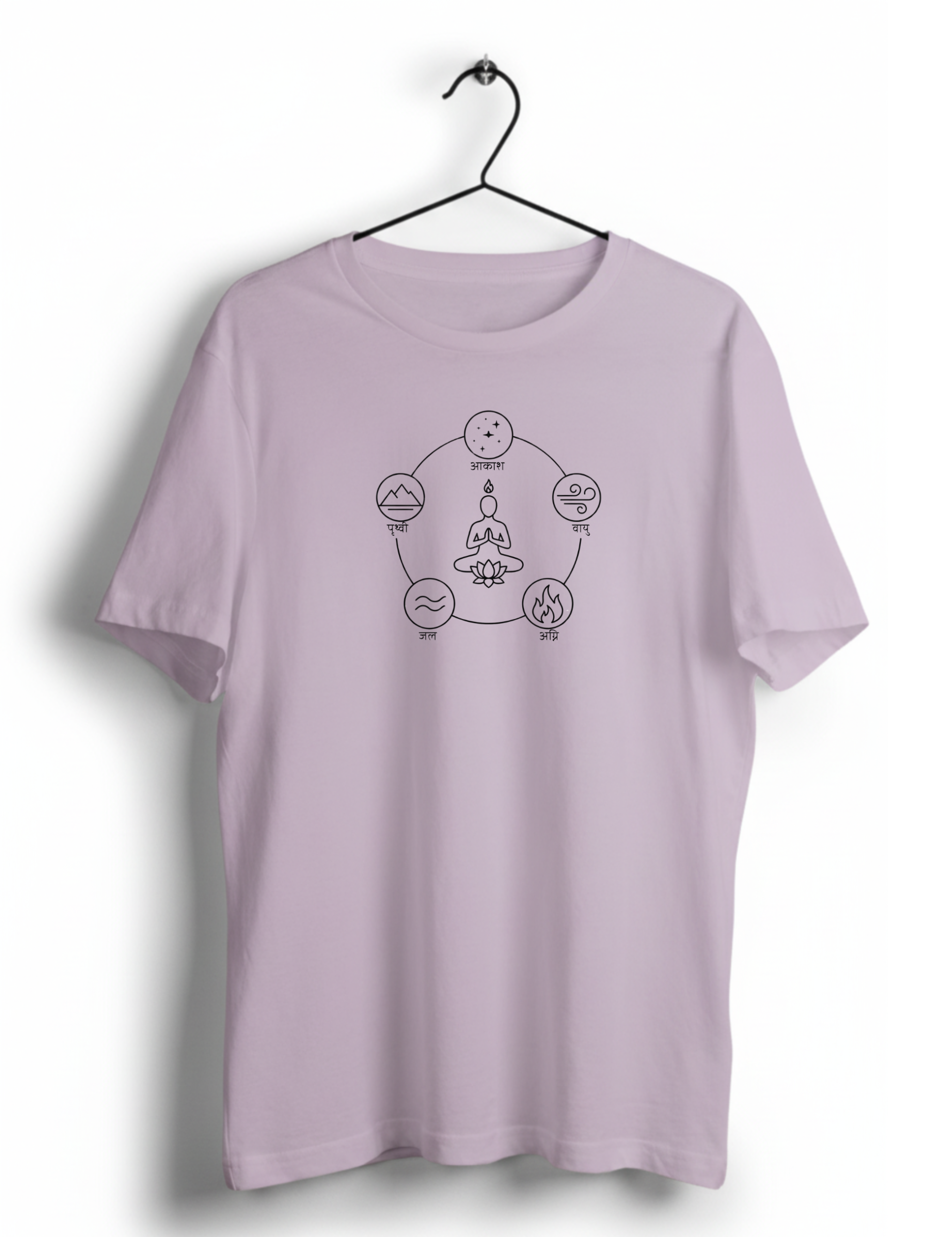 This T-shirt shows a peaceful meditation pose at the center. Around it, the five elements are drawn in a simple circle. You can see sky, air, fire, water, and earth, each with small symbols and Hindi names. The design feels calm and balanced.