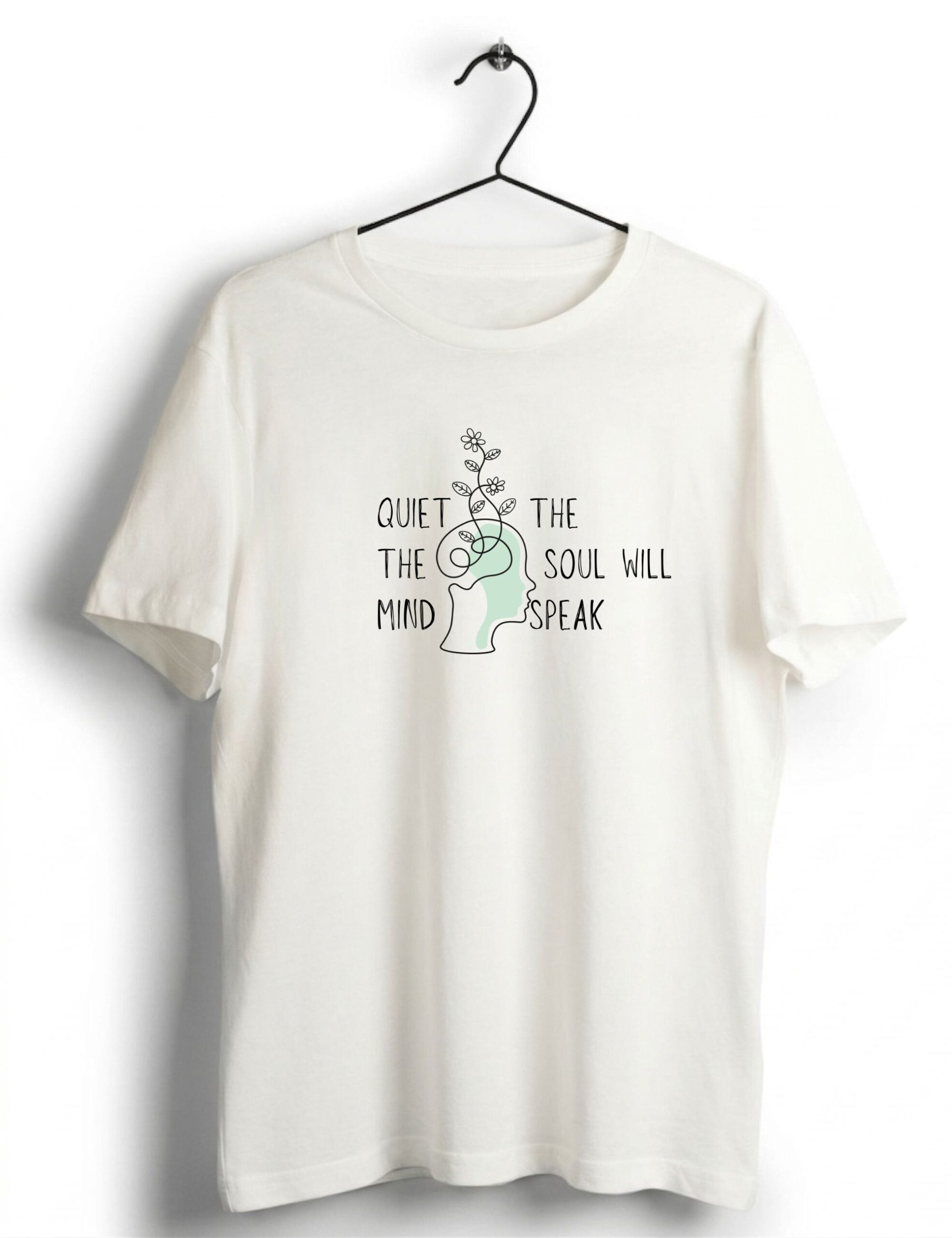 This T-shirt shows a simple line art of a human head with soft shapes inside. A small plant grows from the head, showing calm and growth. Around the design, the text reads “Quiet the mind the soul will speak”. The message is clear and peaceful.