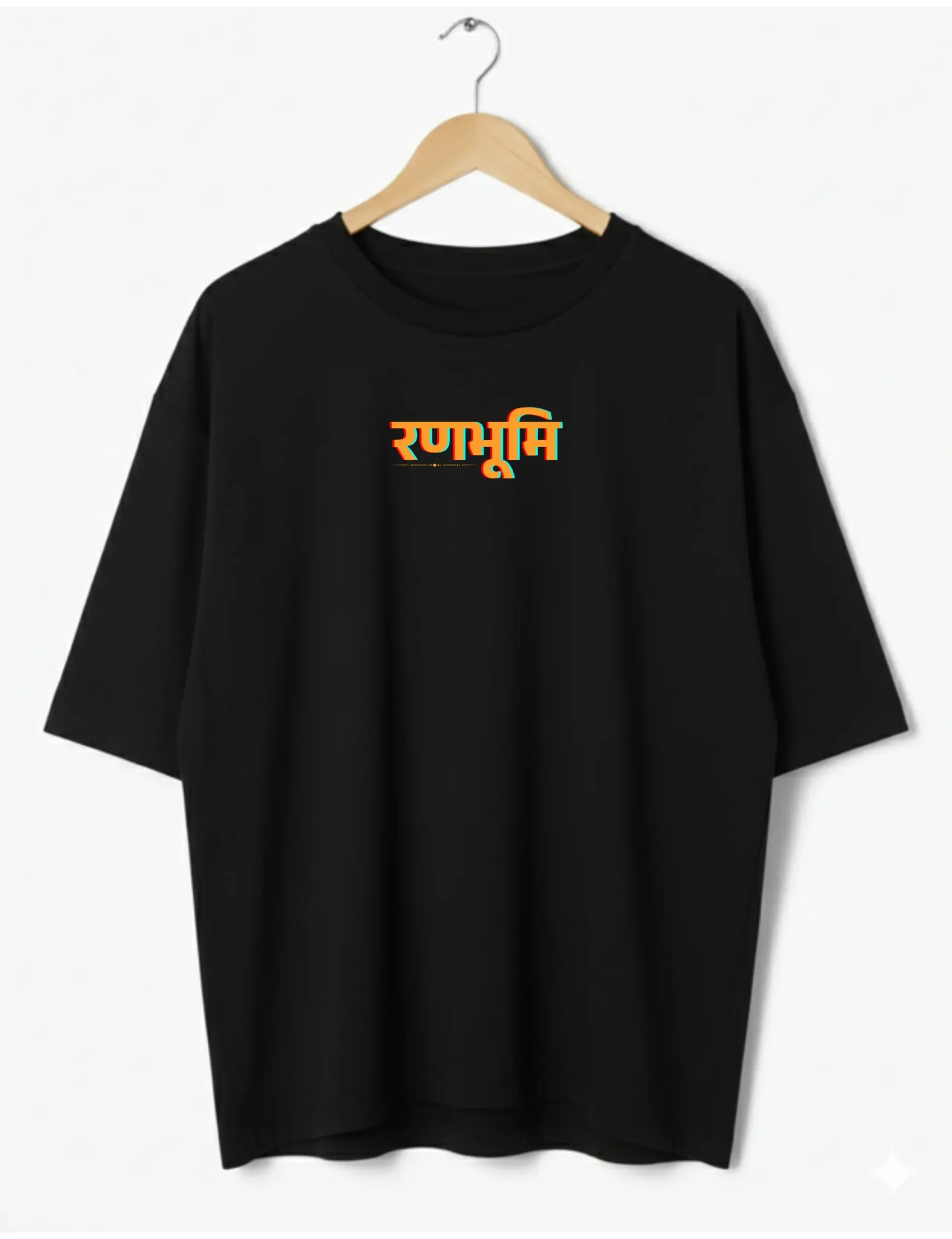 The bold front print features the word “रणभूमि” (Ranbhoomi), while the back design captures the essence of battle with a striking warrior silhouette, invoking the timeless spirit of Kurukshetra.