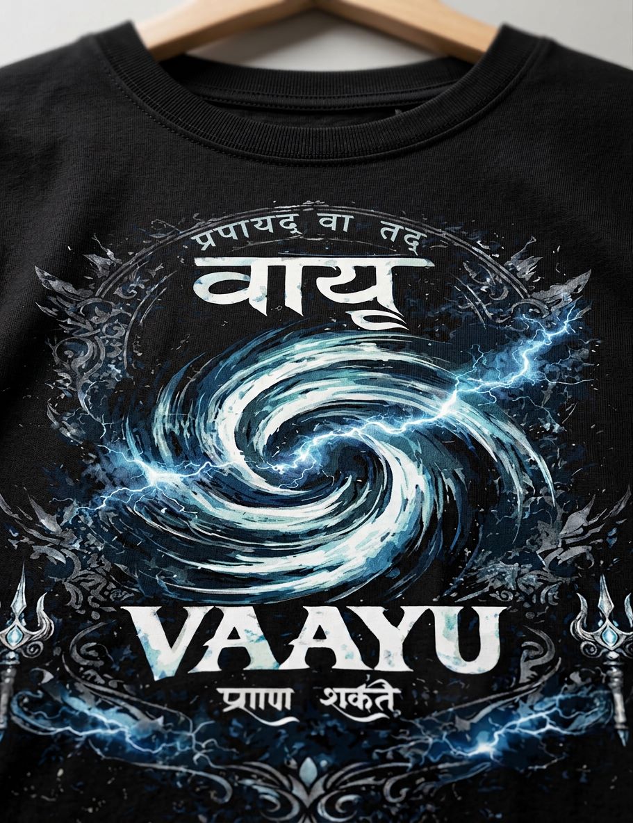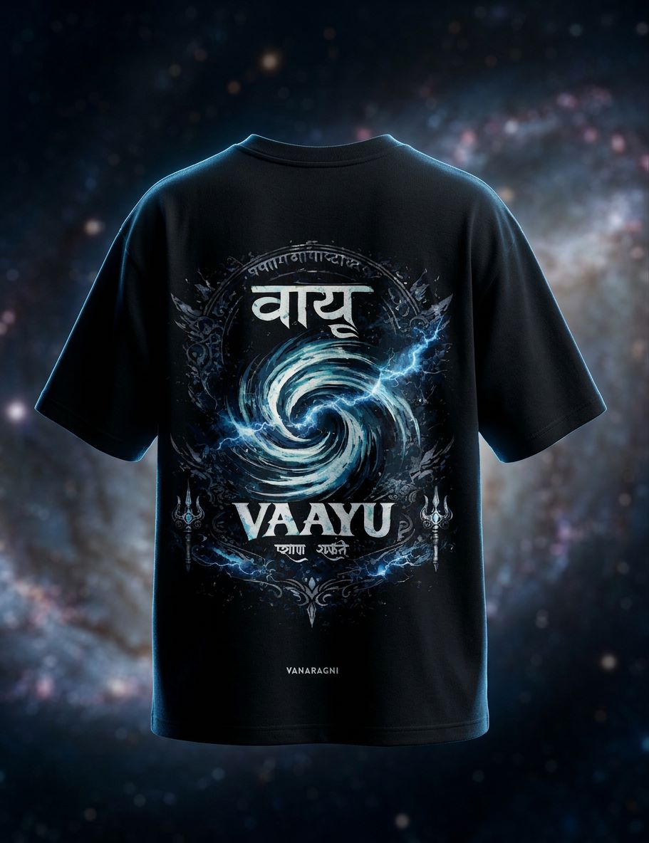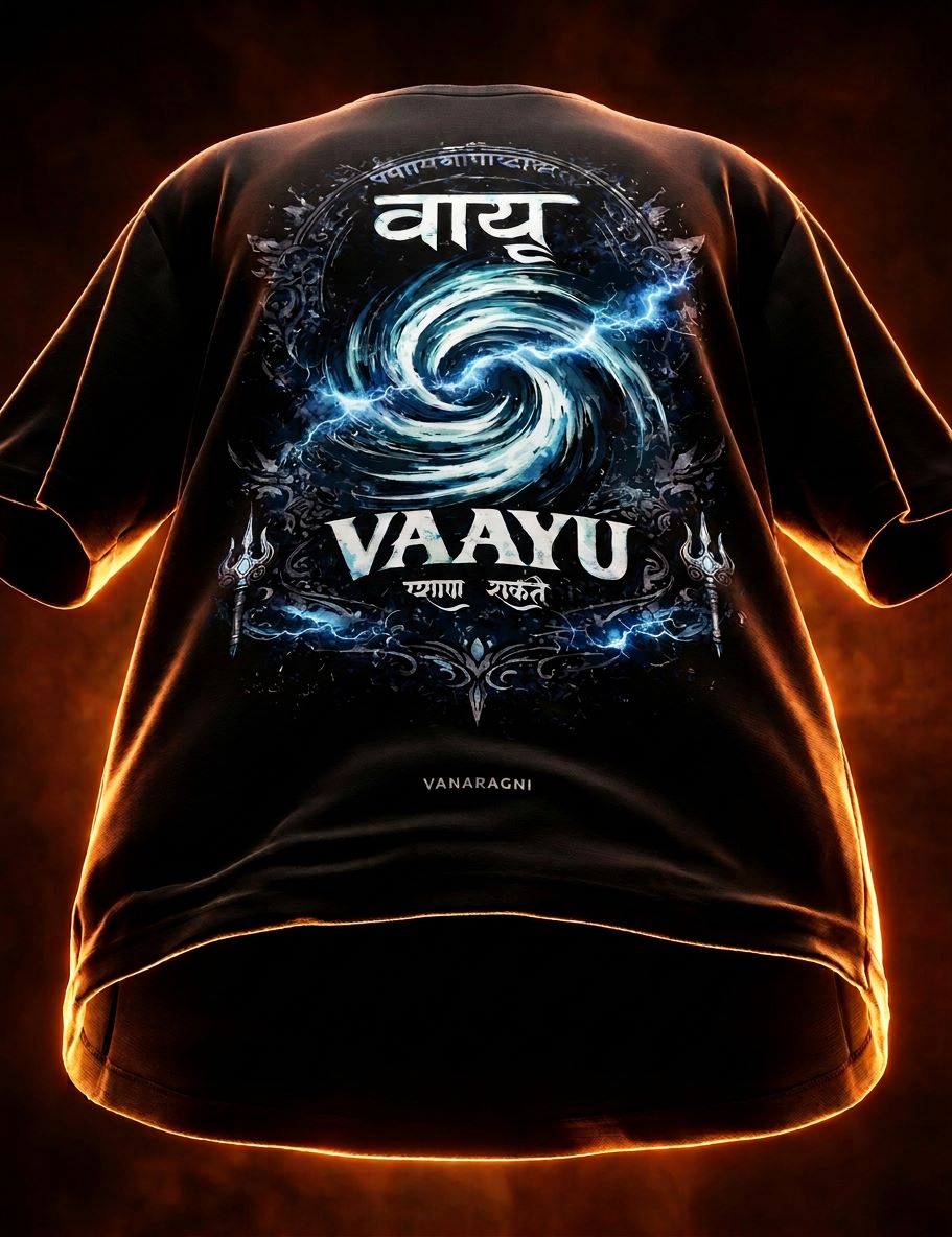 This T-shirt is inspired by Vayu, the force of air. The back design shows a strong wind swirl with electric energy around it. It gives a powerful and fast feel. The design features the Hindi text “वायु” along with “VAAYU” in English, adding a strong cultural touch.