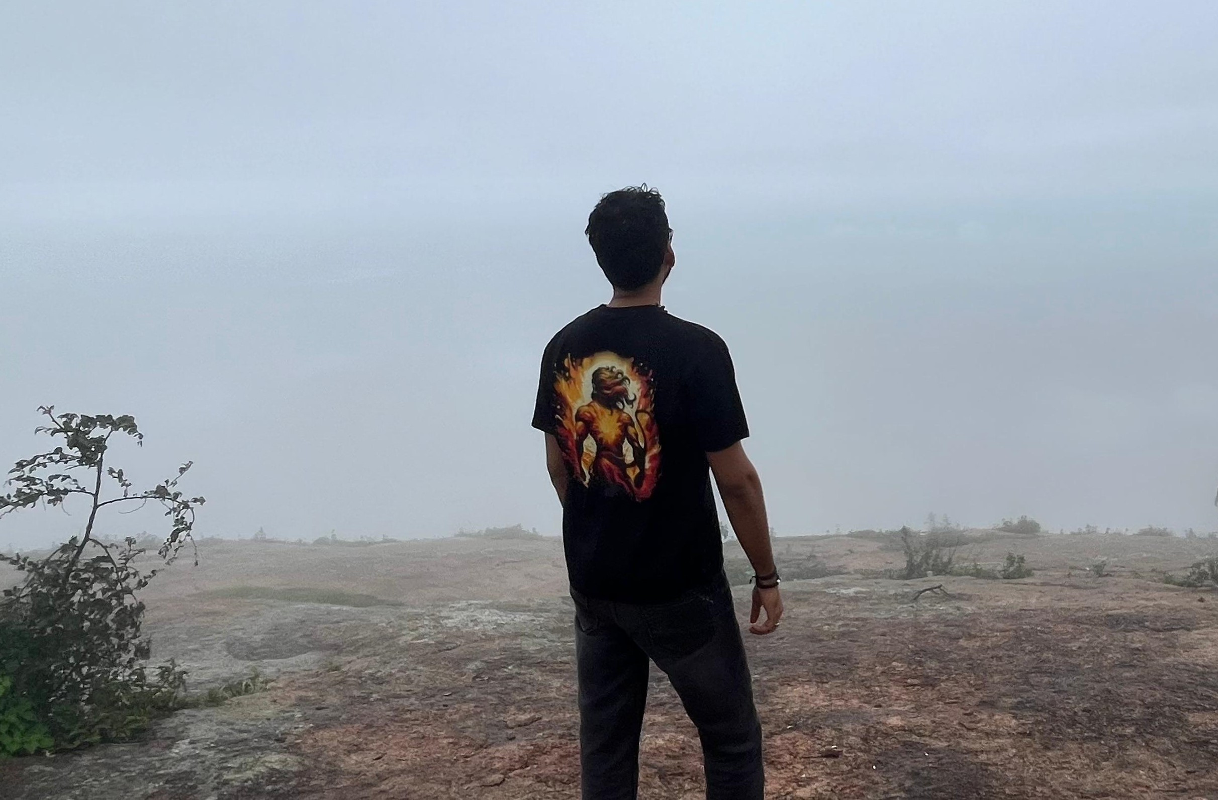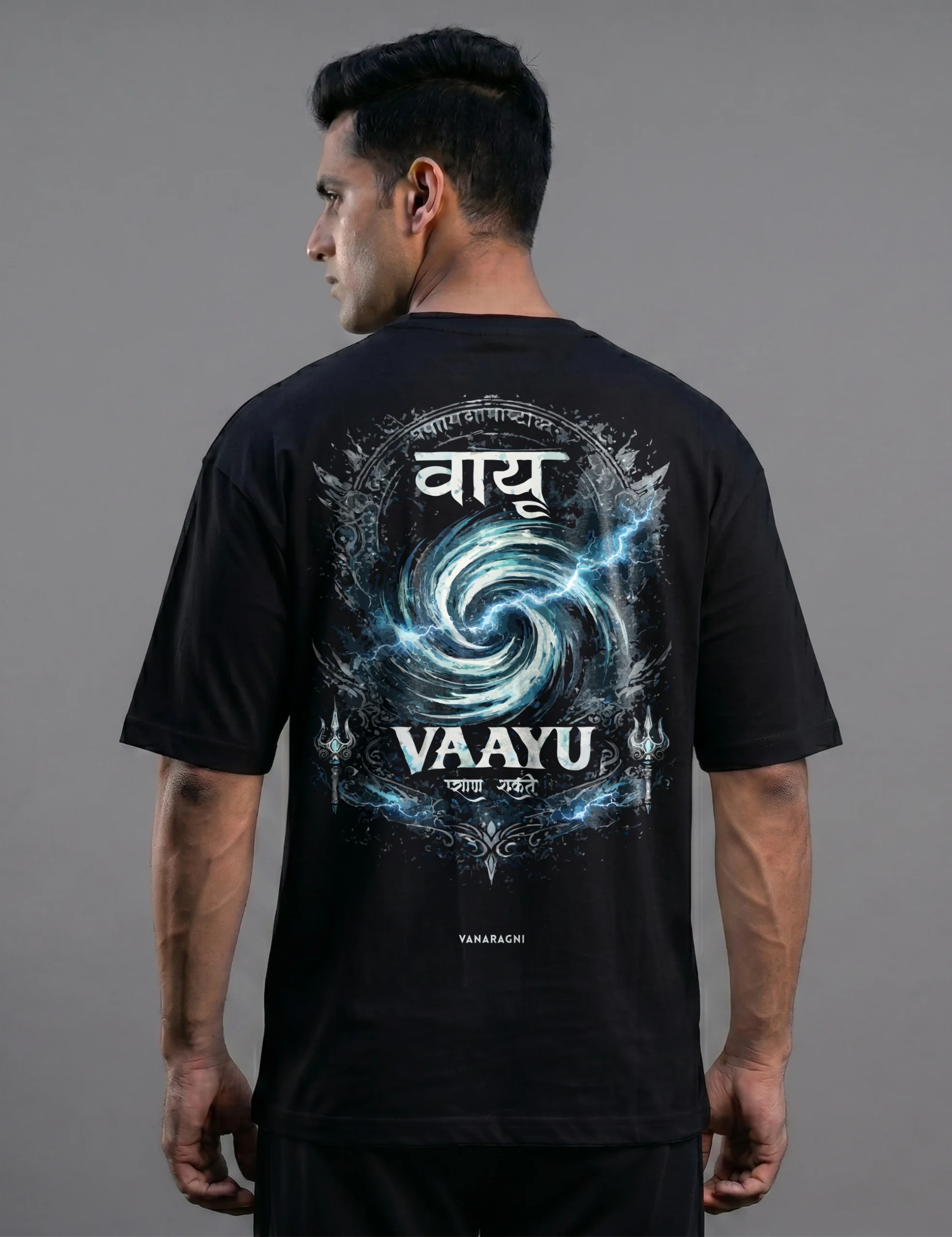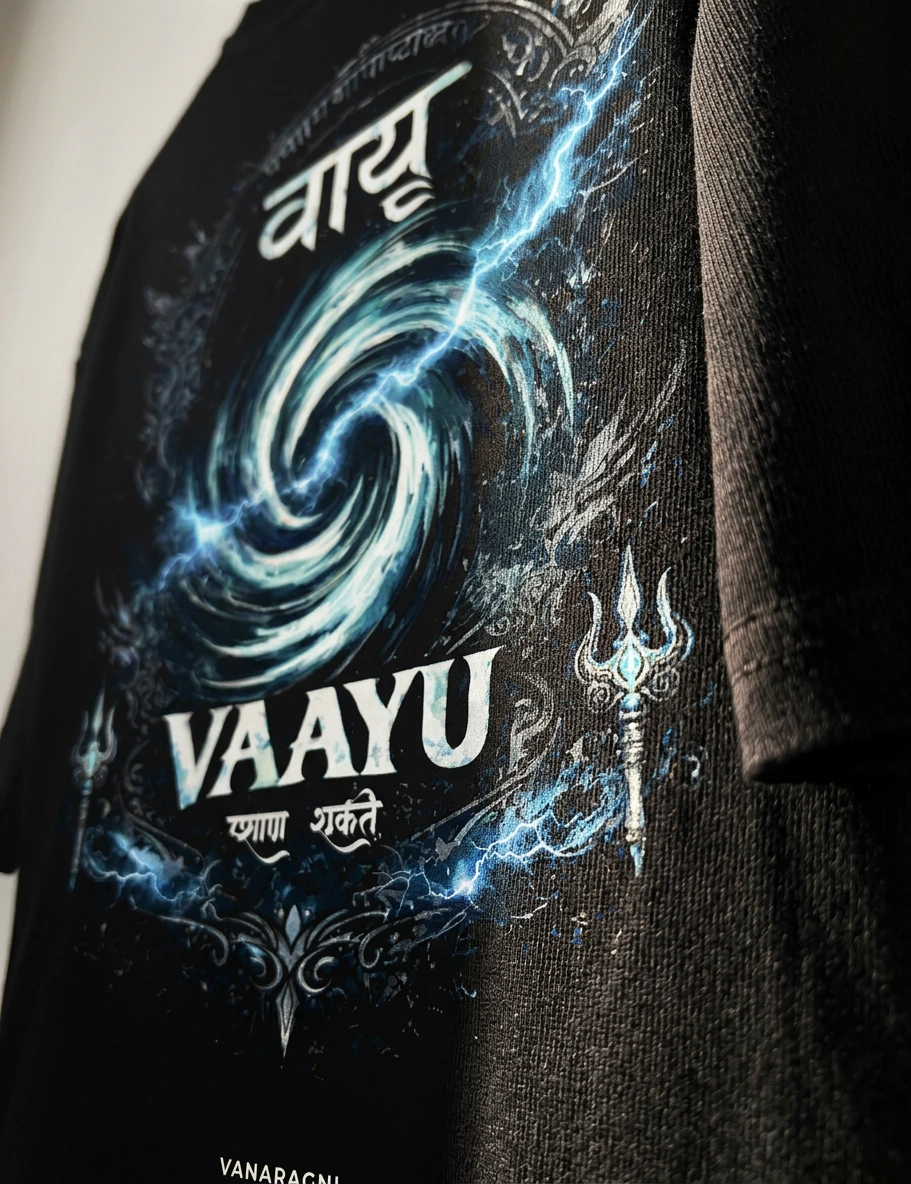 This T-shirt is inspired by Vayu, the force of air. The back design shows a strong wind swirl with electric energy around it. It gives a powerful and fast feel. The design features the Hindi text “वायु” along with “VAAYU” in English, adding a strong cultural touch.