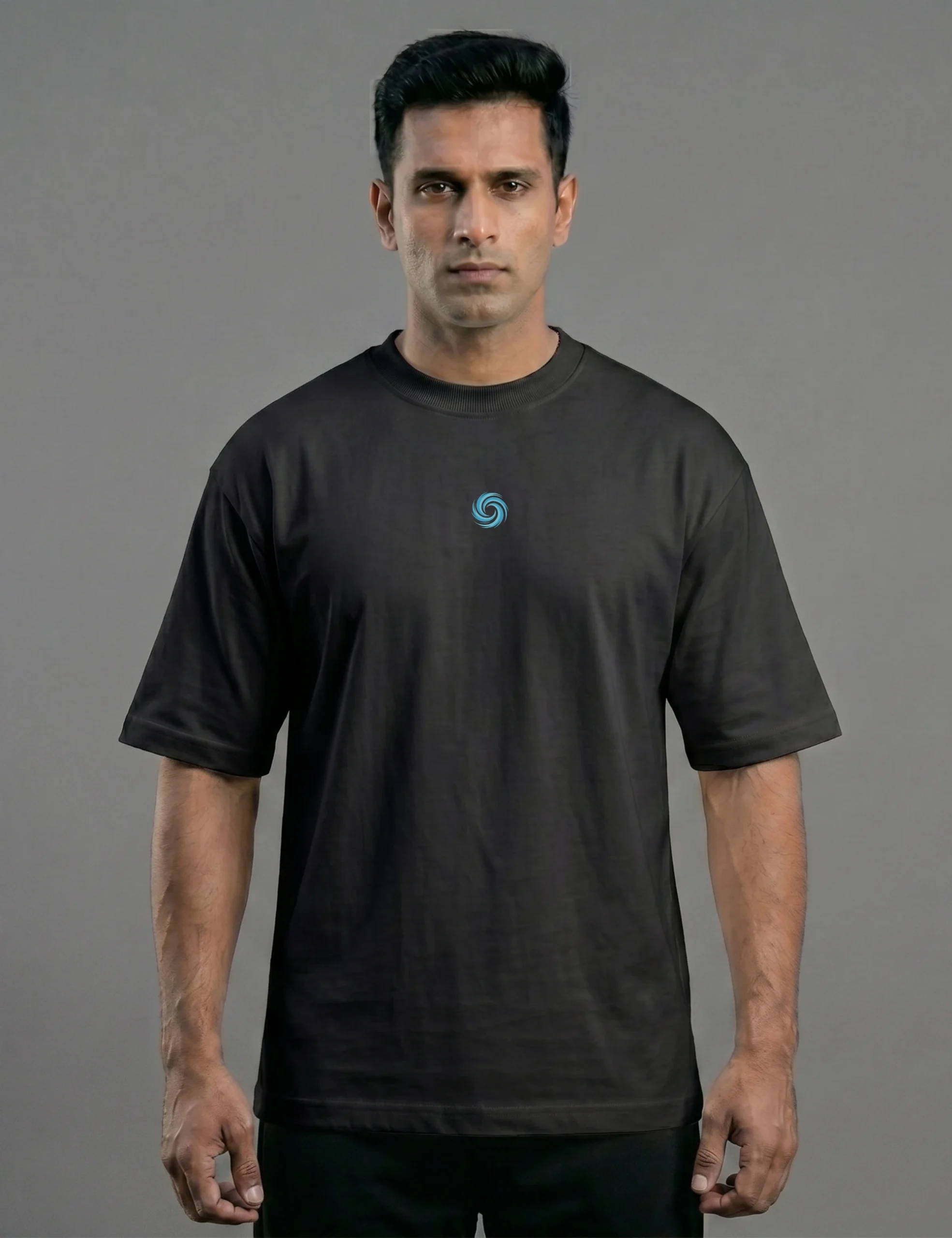 Black Oversized T-shirt with a bold wind swirl design on the back. Inspired by Vayu, the power of air. Features Hindi text “वायु” with a clean front swirl logo.