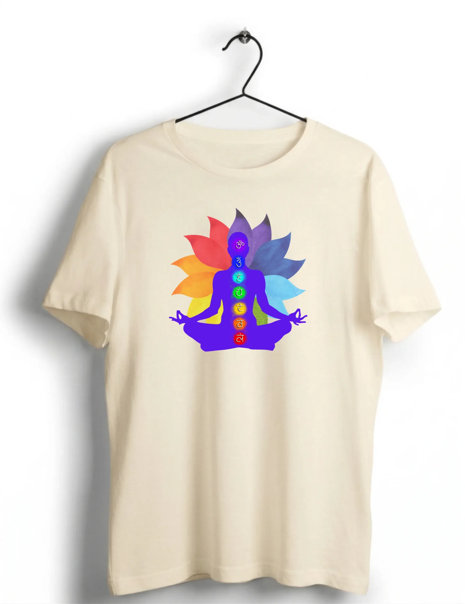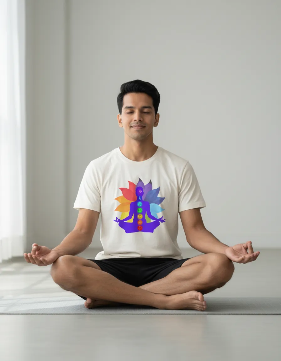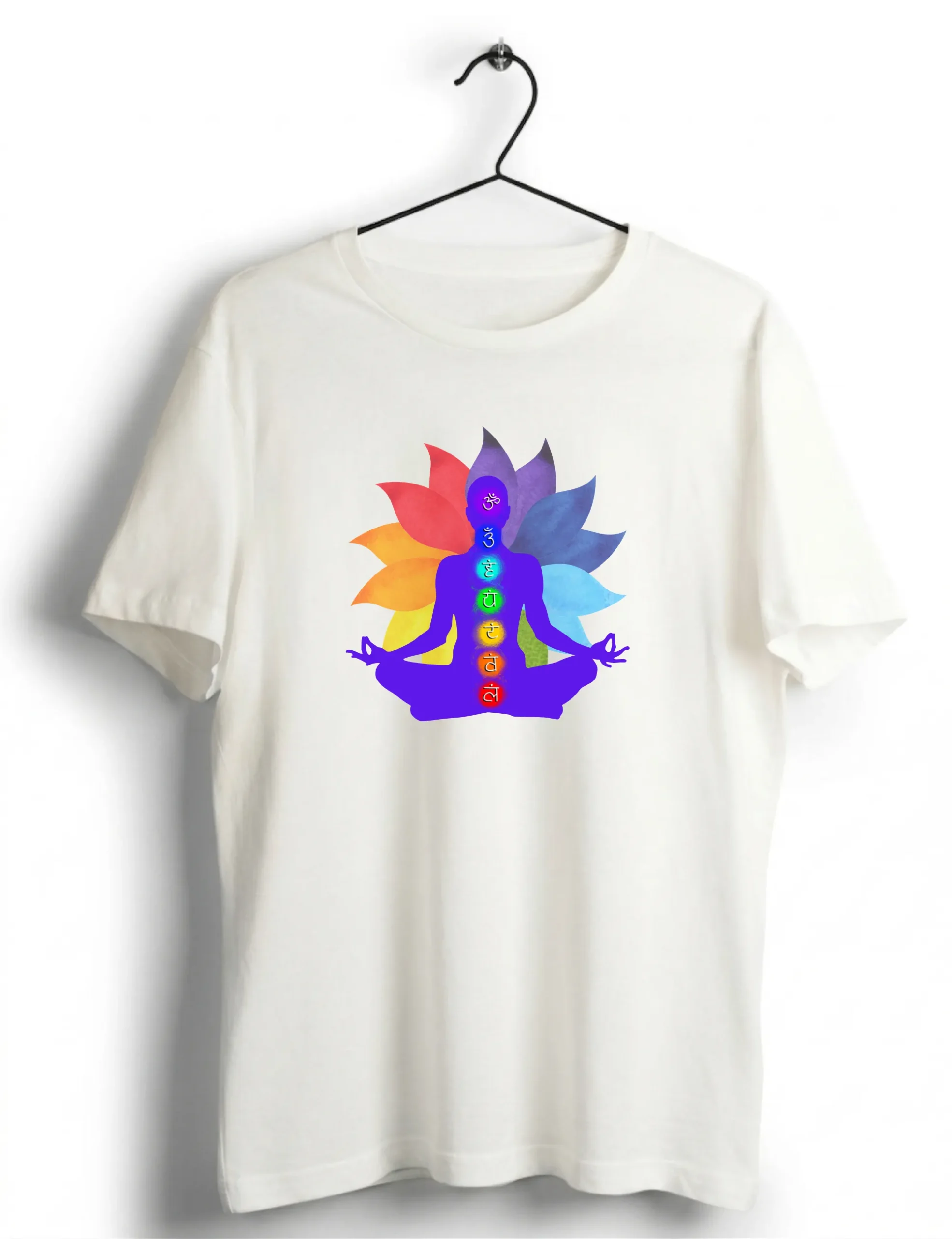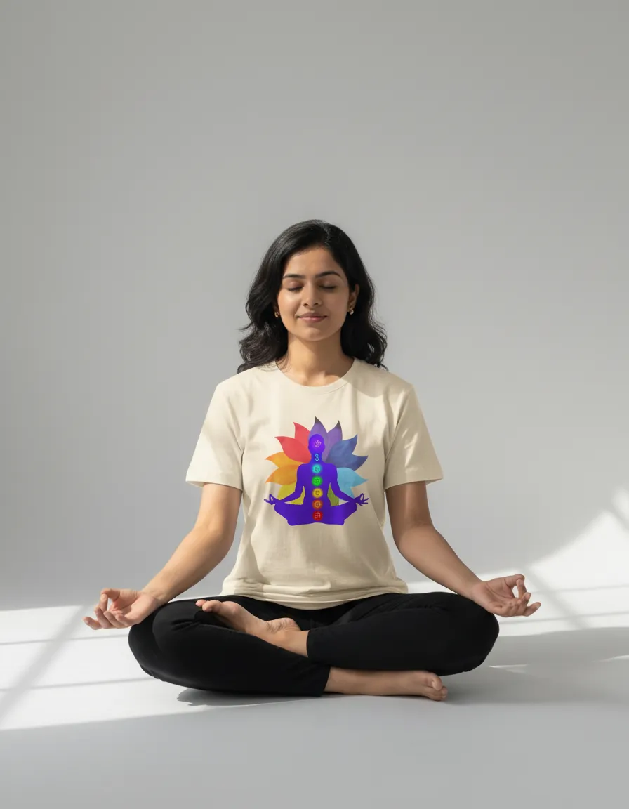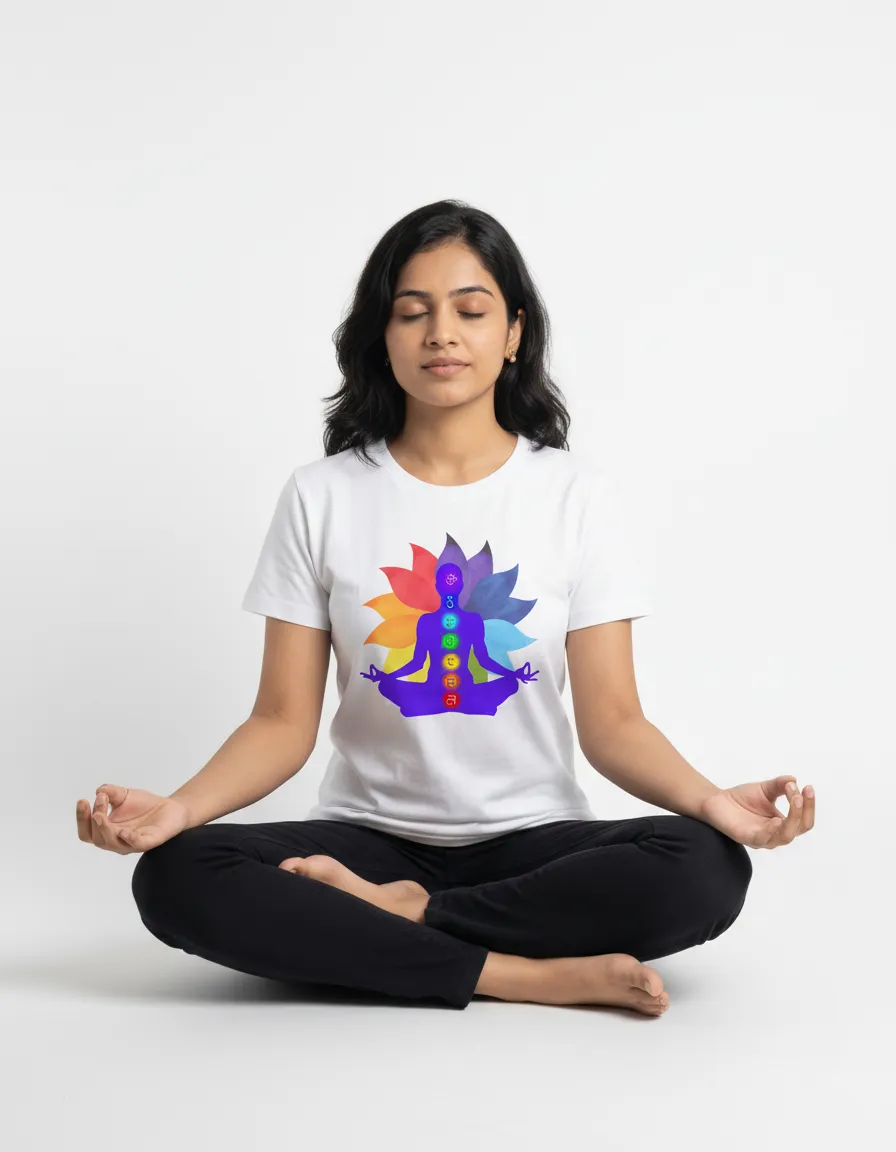 This t-shirt shows a person sitting in a yoga pose. The body has seven chakra symbols in bright colors. Behind it, there is a lotus shape with soft rainbow shades. The design gives a calm and focused feel. It looks clean on the white fabric.