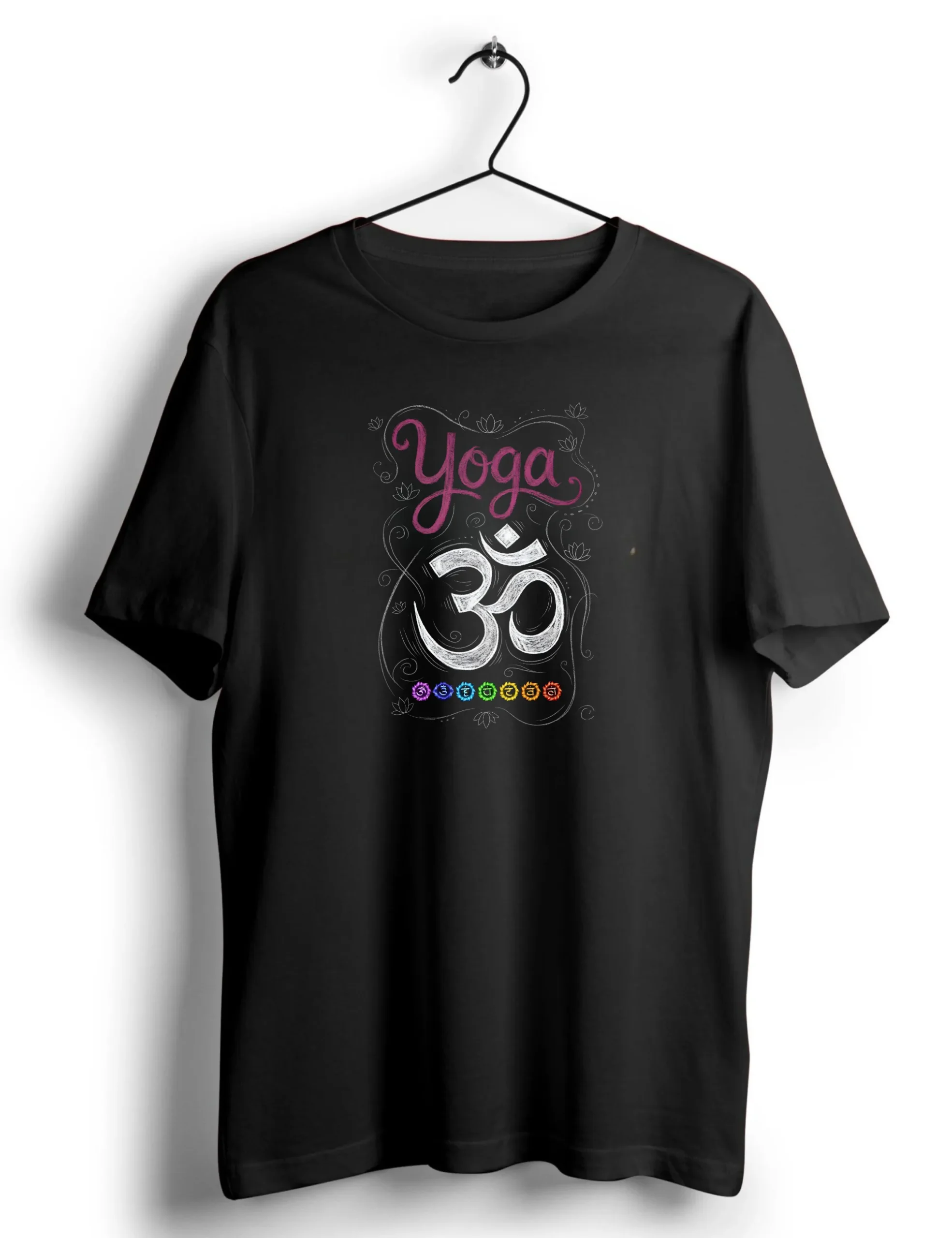 A classic black t-shirt featuring a calming “Yoga” typography with an Om symbol and chakra-inspired detailing, designed for everyday comfort and mindful style.