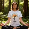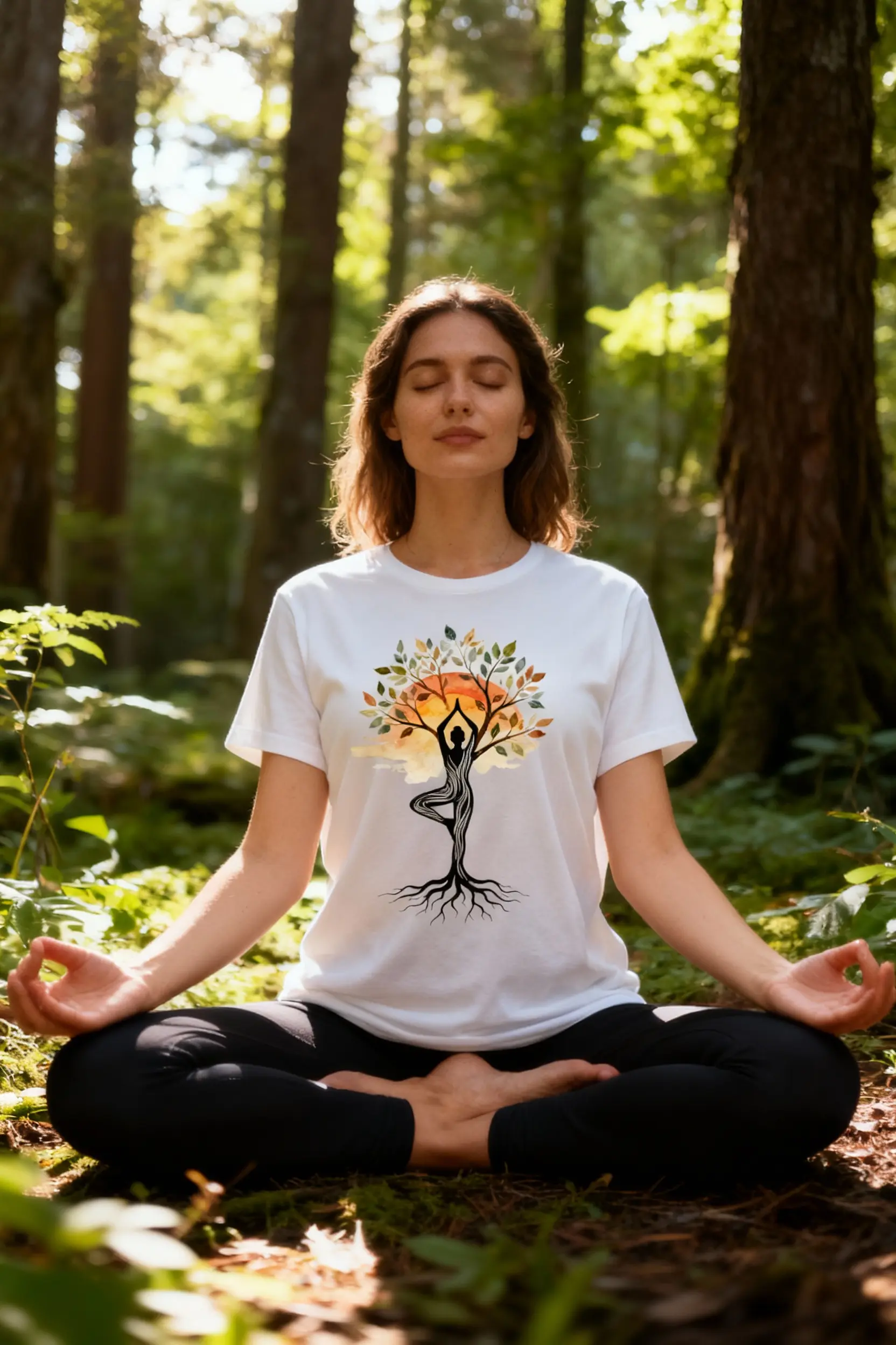 A soft and comfortable T-shirt with a beautiful design of a person doing the tree yoga pose, turning into a tree with colorful leaves. Perfect for yoga and nature lovers.